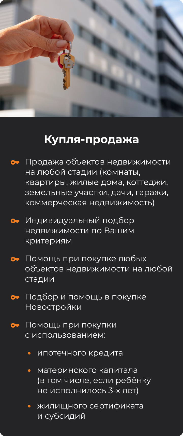 Наши специалисты имеют многолетний опыт работы с недвижимостью и глубокое знание рынка, что позволяет находить самые выгодные и эффективные решения для вас.
